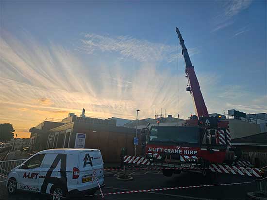 A-Lift are available to carry out weekend and night work and this particular job was booked by a valued customer to take place on a Saturday lifting Air Handling Units to office premises in Northampton whilst they were unoccupied. Utilising our Klaas1003 crane as part of a planned Contract Lift, we installed a number of AHU’s on to the roof. The roof was boarded in advance to enable the AHU’s to be safely moved in to position in the required installation zone reducing the need for a much larger crane and so ensuring the customer was able to achieve the most cost effective lifting solution.